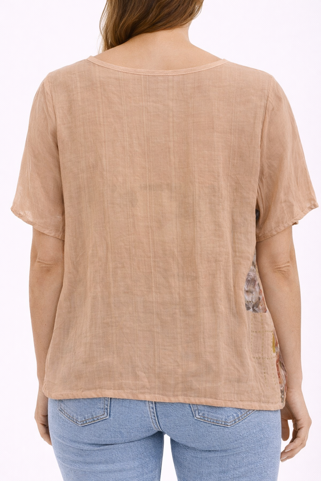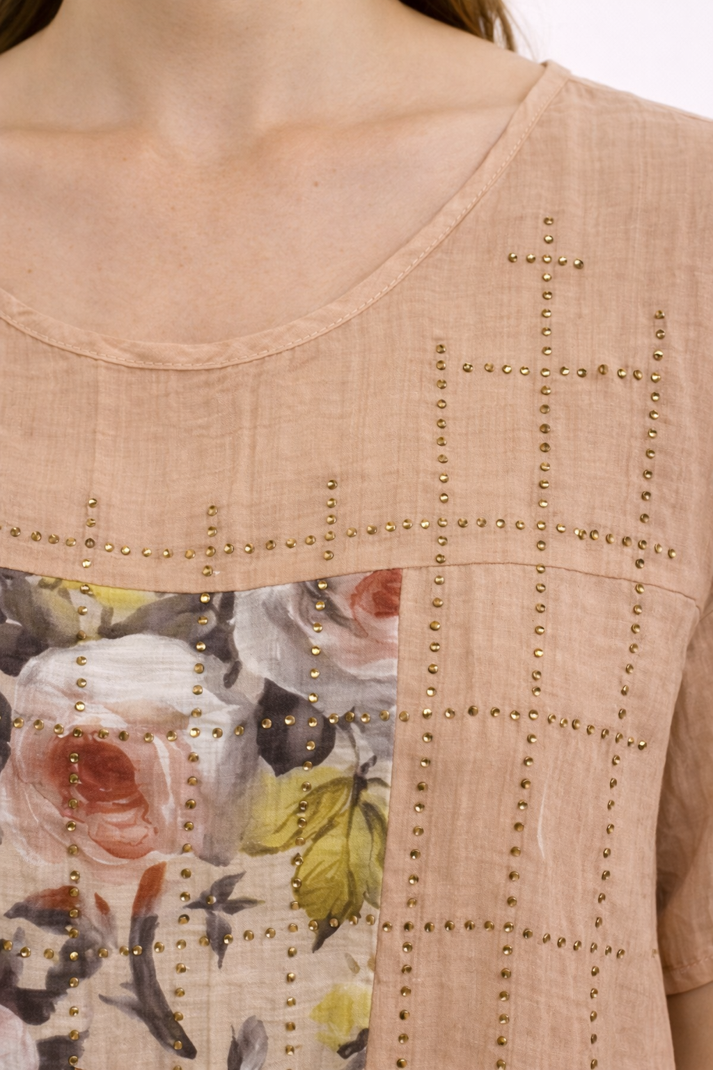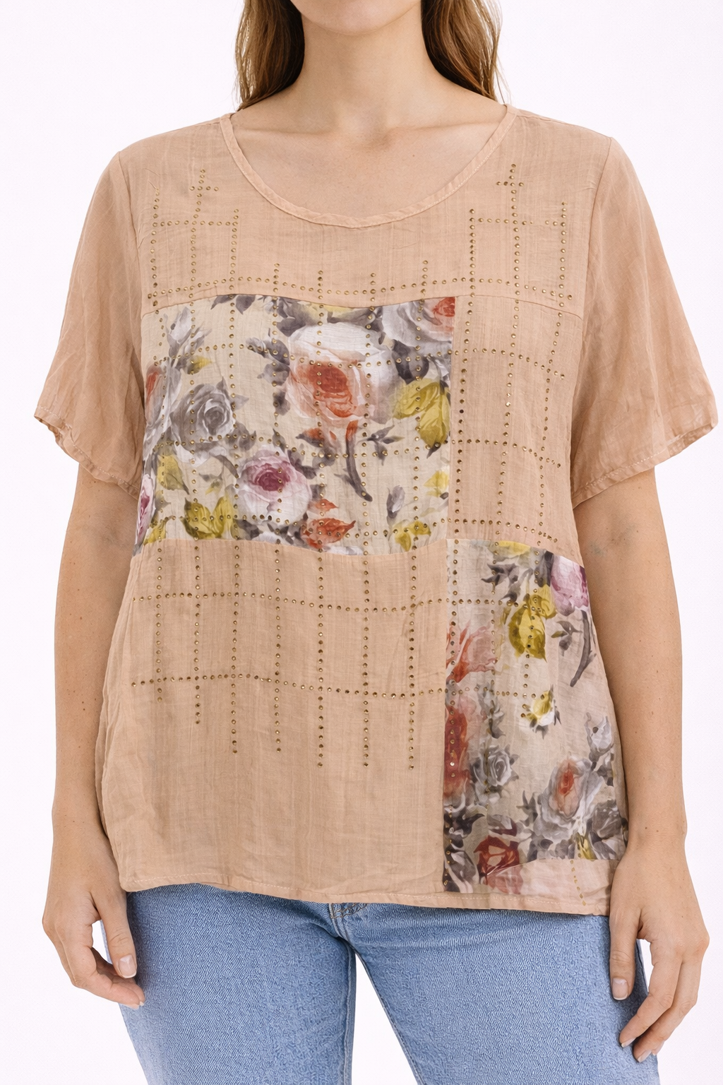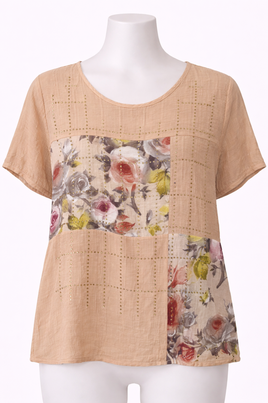 Blusa en tono beige suave, de diseño femenino y delicado, con paneles estampados florales en tonos pastel que aportan un estilo romántico y elegante. Su corte recto y holgado la hace muy cómoda, ideal para el uso diario o para ocasiones casuales donde quieres verte arreglada sin perder confort.