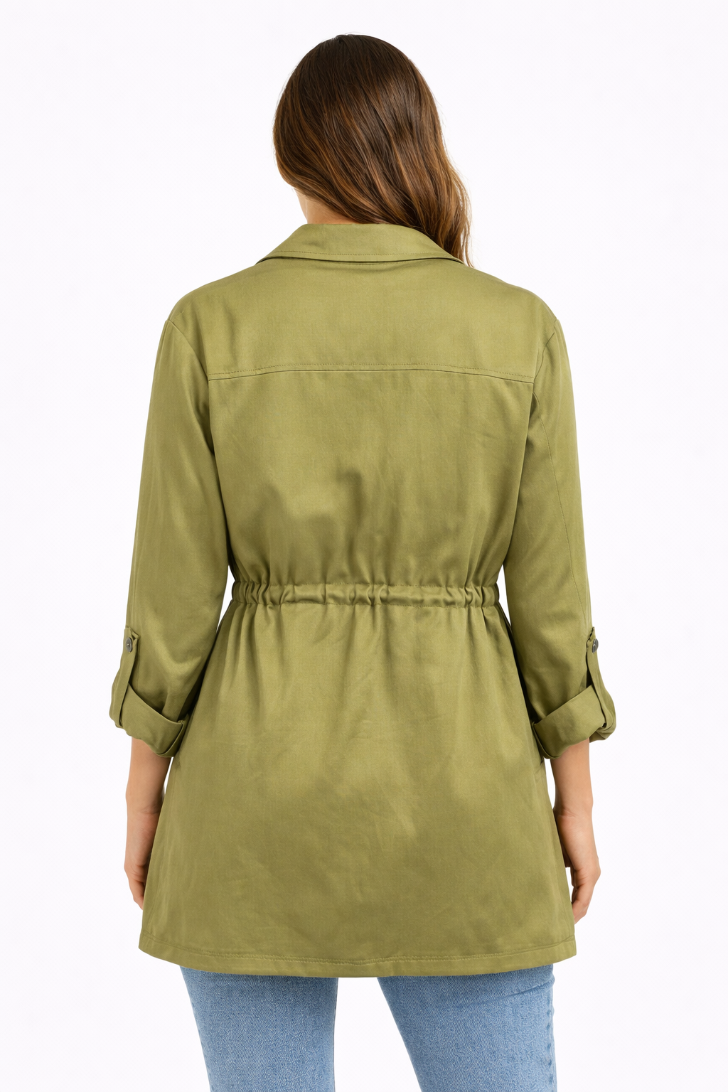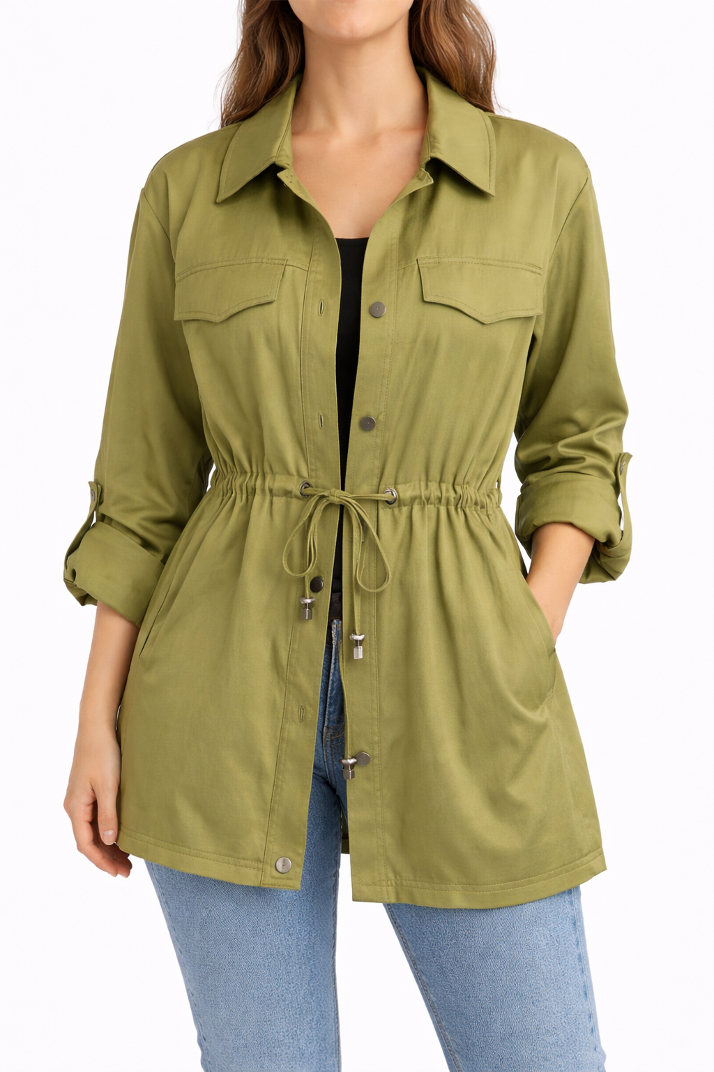 Diseño con solapa clásica, bolsillos cargo frontales, mangas largas enrollables y cordón ajustable en la cintura para definir el calce.