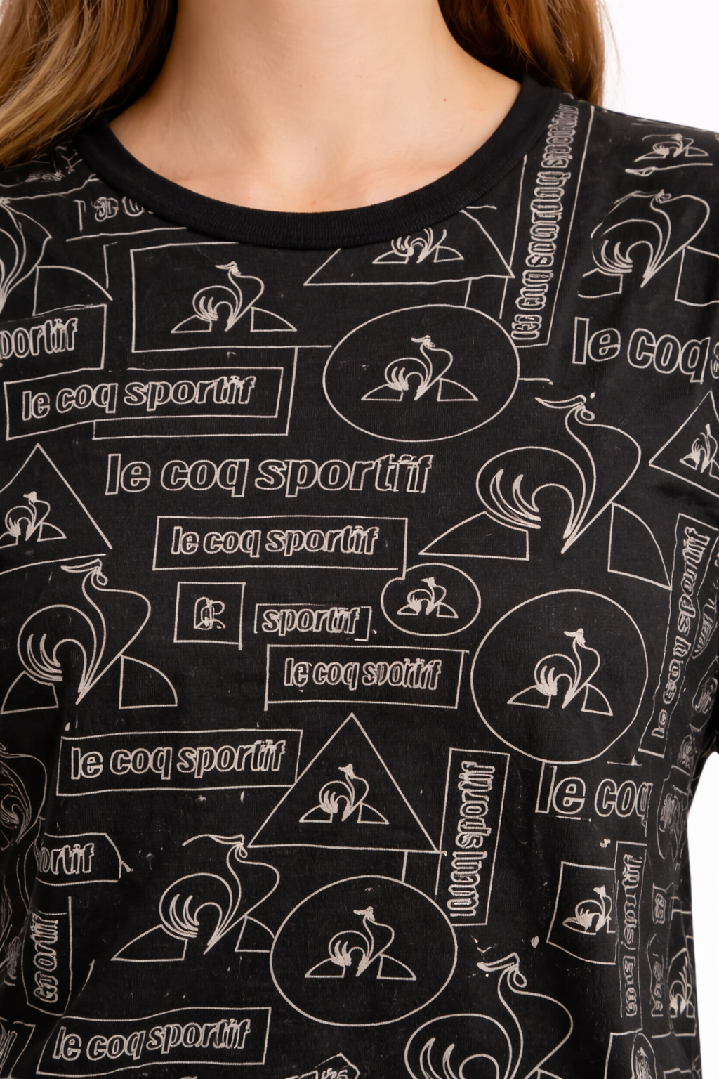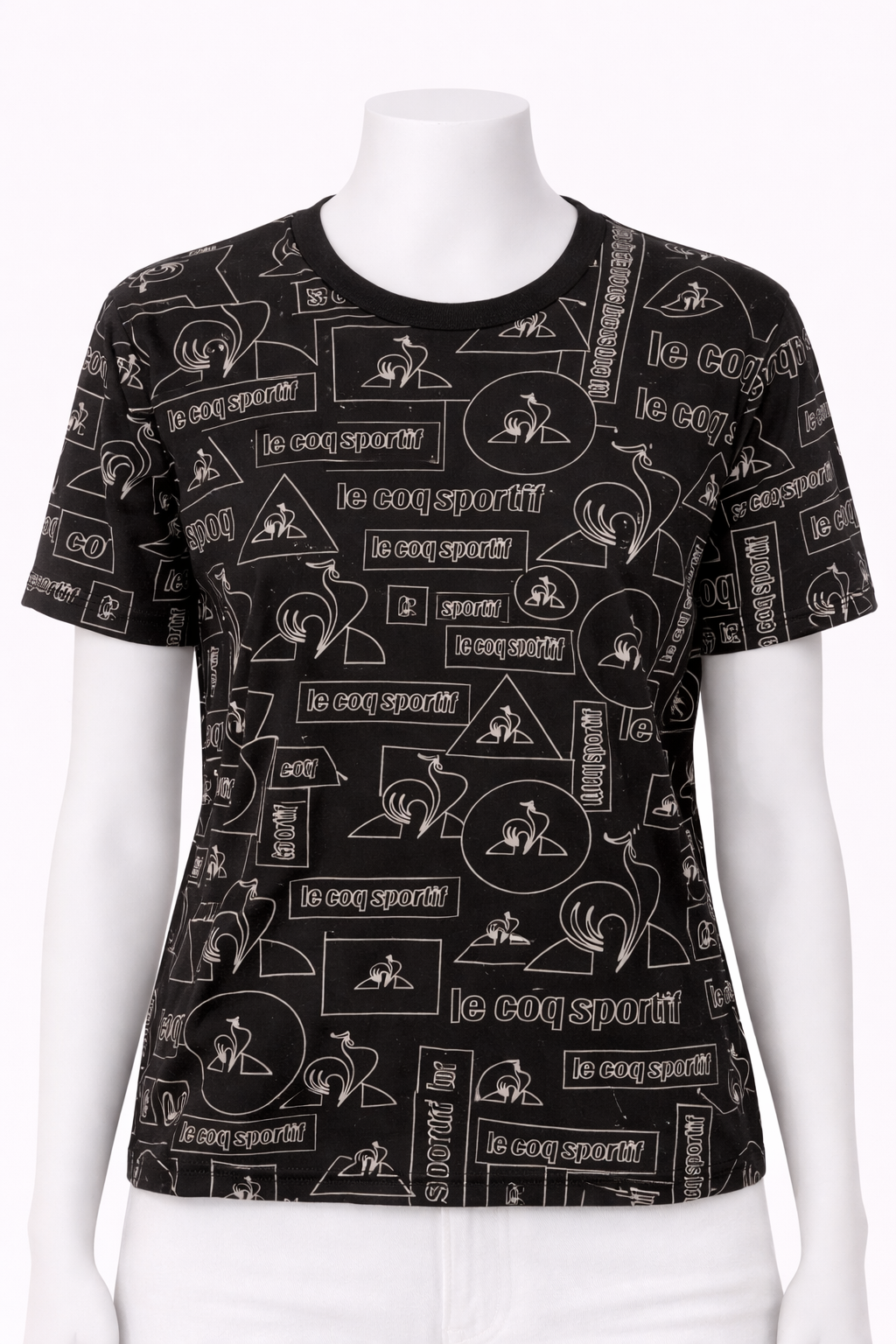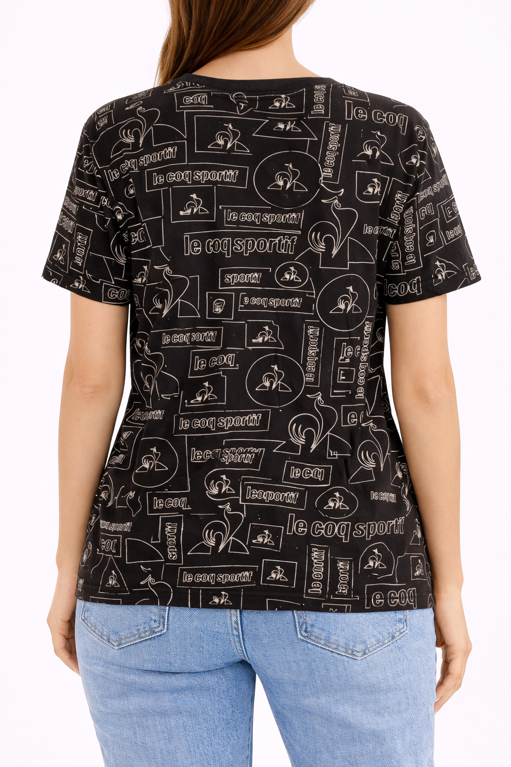 Polera Le Coq Sportif en color negro con estampado gráfico integral de logos y figuras icónicas de la marca, que le da un estilo deportivo–urbano muy distintivo. Un diseño llamativo pero fácil de combinar, ideal para looks casuales con personalidad.